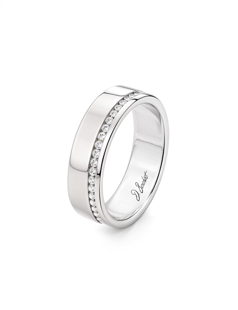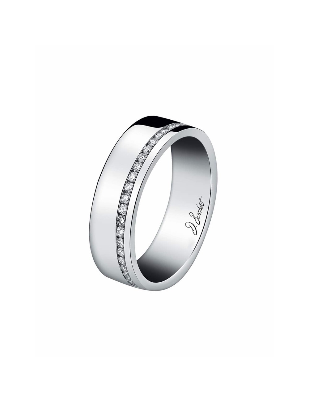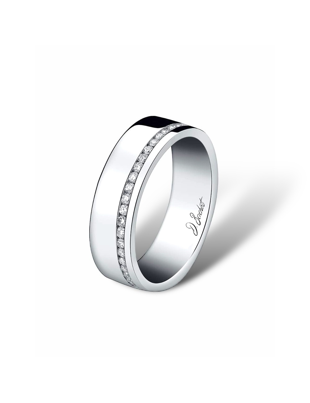In platinum, pink gold or yellow gold, graphic and modern, it is a powerful and dazzling eternity wedding band. With a width of 6 mm, discover a wedding ring that gives a contemporary spin to the jewelry codes with its geometrical design. Just as comfortable to wear as a thinner wedding ring, white diamonds are set on one side all around the band. Handmade in our workshops in France, this wedding ring is also set with white diamonds.