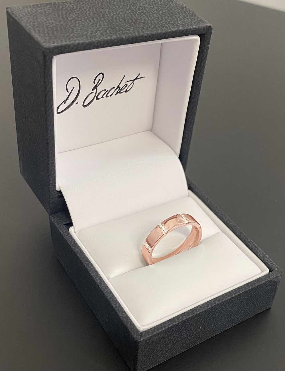 Discover a graphic, modern and sophisticated wedding band. It's a women's wedding ring that breaks free of convention, punctuated with 8 rows of white diamonds, like a bridge between two souls forever united. In platinum, yellow gold or pink gold, this jewelry creation illustrates modern lines for couples looking for a timeless ring with contemporary sobriety. Also made set with black diamonds, this wedding band is custom-made and on demand, according to the finger size, in our jewelry workshops in France.