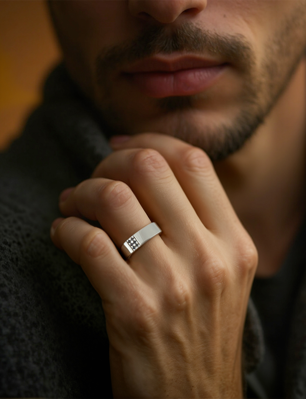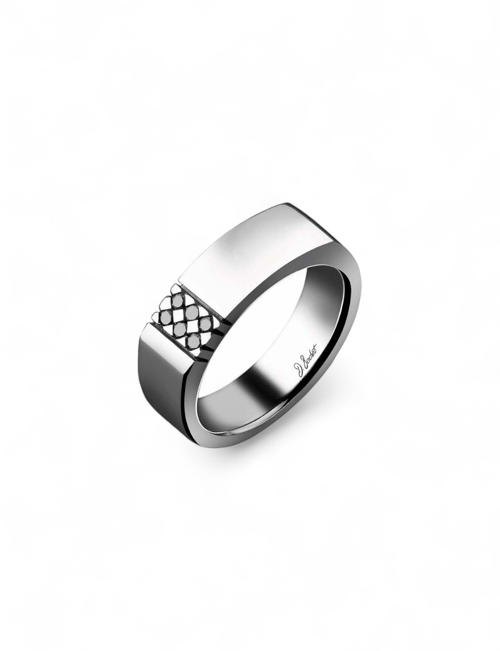 Discover Dandy, an ultra-modern men's signet ring designed for trendsetters seeking an original and unique style. Combining refined elegance and bold design, this men's platinum ring with sleek lines is distinguished by black diamonds, creating a striking contrast. The perfect jewelry piece for the modern man who wants to assert his personality and refinement, the Dandy signet ring embodies the essence of daring and charm. Ideal for a resolutely dandy look, this one-of-a-kind ring perfectly blends timeless elegance and contemporary creativity.