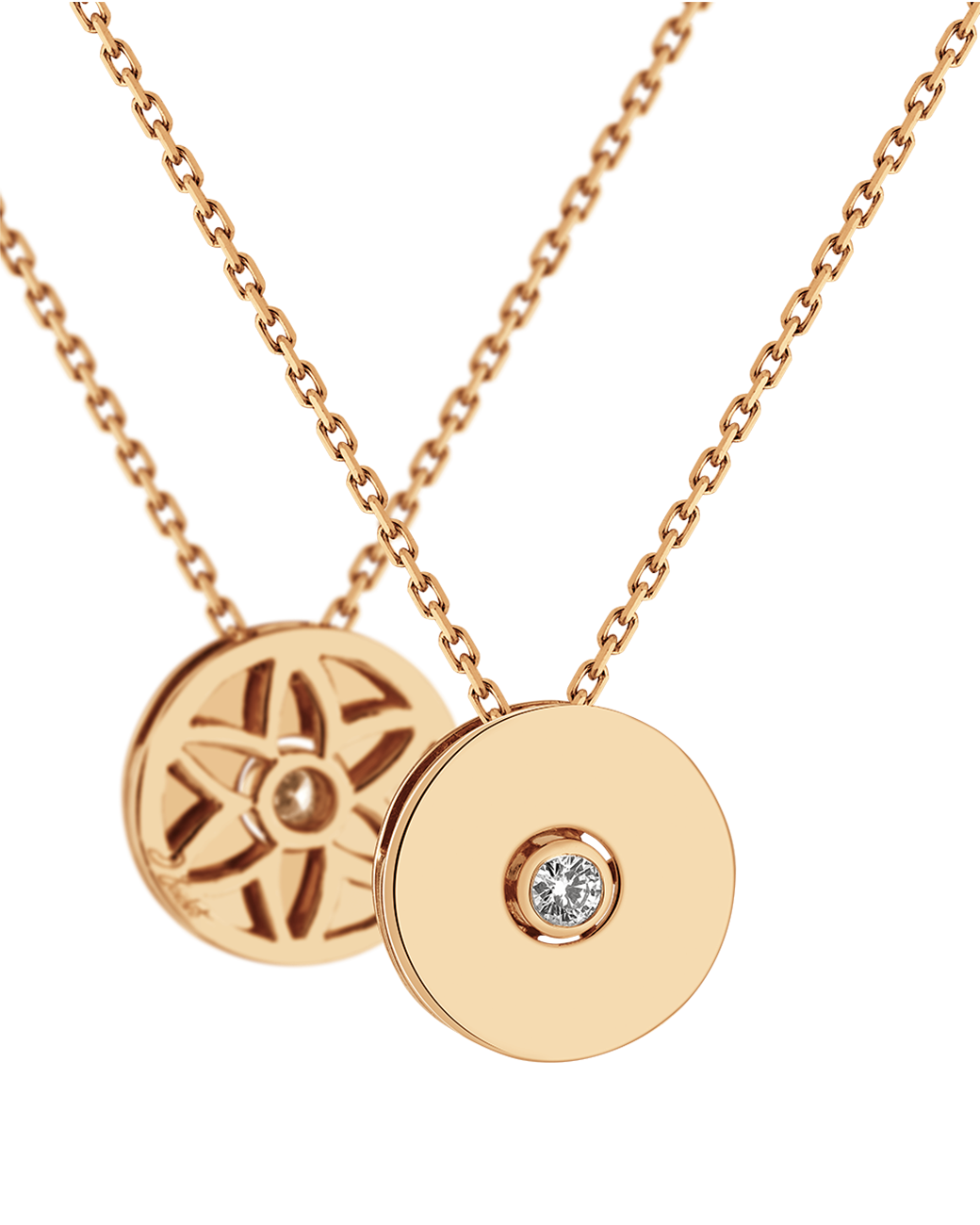 The Monade symbolizes unity, blending elegance with deep meaning. Handcrafted in your choice of rose, white, or yellow gold, this pendant features a radiant white diamond at its heart, symbolizing the soul's depth. Hidden close to your heart, the intricate Flower of Life design embodies the timeless bond between the soul and the body. The Monade pendant is not just a piece of luxury jewelry; it's a statement of style and spirituality, perfect for the modern woman who values uniqueness and significance in her collection. Opt for this gold Flower of Life pendant and elevate your ensemble with a piece that's as meaningful as it is beautiful.