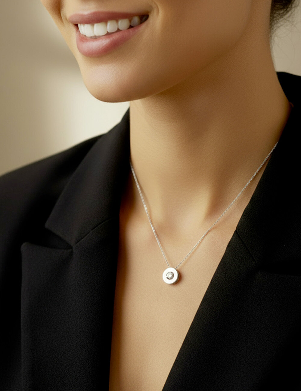 The Aura necklace by D.Bachet combines 18-carat gold — available in yellow, white, or rose gold — with a natural 0.20-carat white diamond delicately suspended as if floating. Its three fine prongs allow light to pass through, revealing the beauty of the precious stone. The subtle openwork highlights the purity of the natural white diamond and the harmony of the design. Crafted in our French workshop, the Aura necklace embodies an essential elegance, designed to accompany every moment.