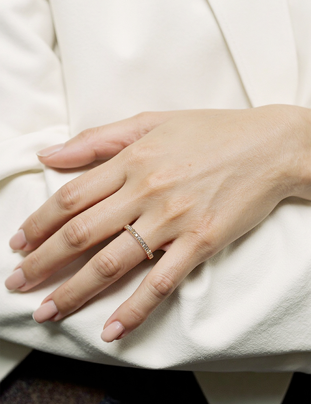 The Passion women’s wedding band is a delicate and refined creation, carefully crafted in our atelier. Its French V-split prong setting highlights the brilliance of thirteen natural white diamonds, each weighing 0.02 carat, ethically sourced in accordance with the Kimberley Process.